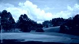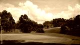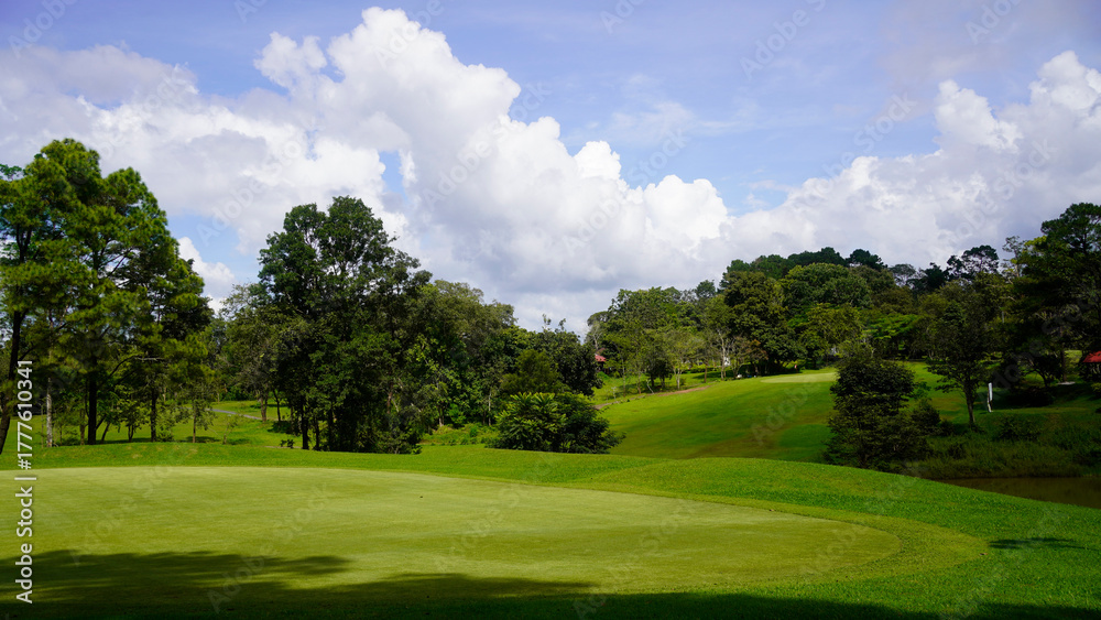 Green grass and woods on a golf field. View of Golf Course with beautiful putting green.