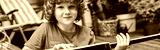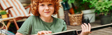Redhead and curly boy enjoying music while playing guitar by the campervan