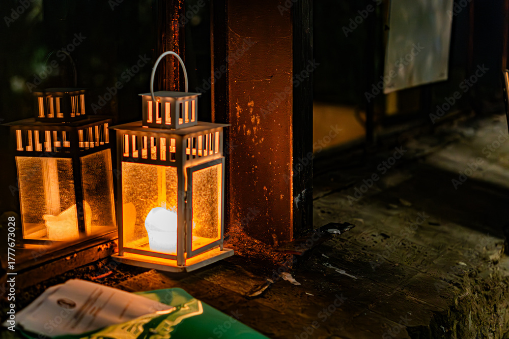 Two traditional white lanterns lantern, glass enclosure in a dimly lit scene, one larger and closer, the other smaller towards the right Background dark wooden furniture Mood lighting, shadows,