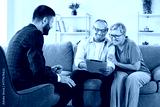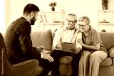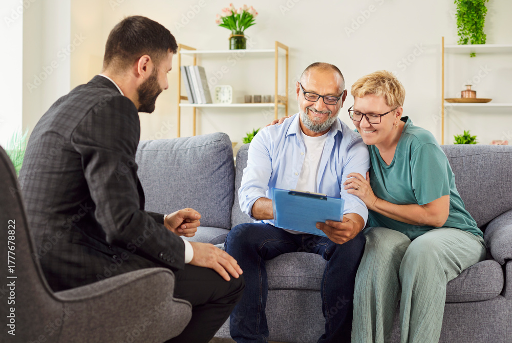 Smiling elderly couple meets agent at home, reviewing documents and signing agreements while discussing real estate options. Seniors discussing insurance or investment contract with advisor