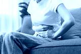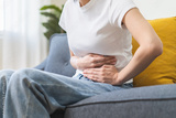Sick asian young woman in pain, hand holding belly, stomach pain from food poisoning, girl hurt abdomen ache and digestive problem, gastritis or diarrhea. Health care inflammation, abdominal problem