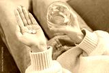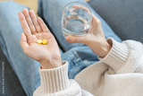 Sick, asian young woman, girl hand holding pill capsule, painkiller medicine from stomach pain, head ache, pain for treatment, take drug or vitamin and glass of water at home, pharmacy and health care