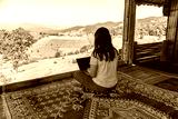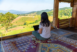 Rear view of a woman freelancer using a computer on a rustic terrace. Working remotely with a beautiful, peaceful countryside landscape and rice field view in Asia.