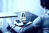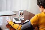 Video call with doctor telemedicine concept. Senior woman measuring her blood pressure. Retired uses medicine digital device tonometer for control health at home.
