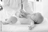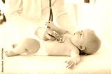 Pediatrician examines baby using stethoscope to listen to baby's chest checking heart beat. Child is looking at doctor