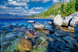 Lake Tahoe California USA view of clear turquoise water with granite rocks and pine forest along mountain shore under blue sky with clouds scenic summer landscape of Sierra Nevada nature