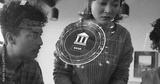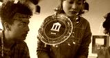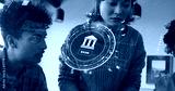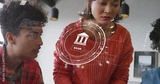 Collaborating Asian woman in red sweater leaning at table in office, exploring banking hologram