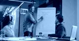 Lead presenter writing development marketing CRM on flipchart in conference room, with sticky notes