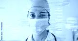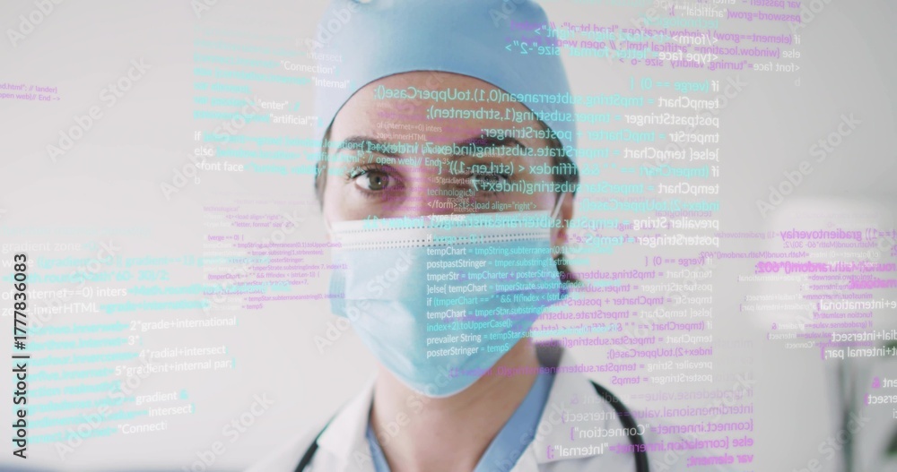 Female doctor analyzing floating code overlay in clinic, with stethoscope, medical mask, lab coat