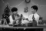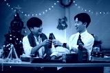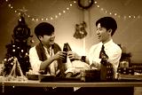 Two cheerful colleagues toast with bottled drinks during an office Christmas party, surrounded by festive lights and gift boxes
