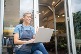 Smiling female florist using laptop to manage online flower orders in small shop.