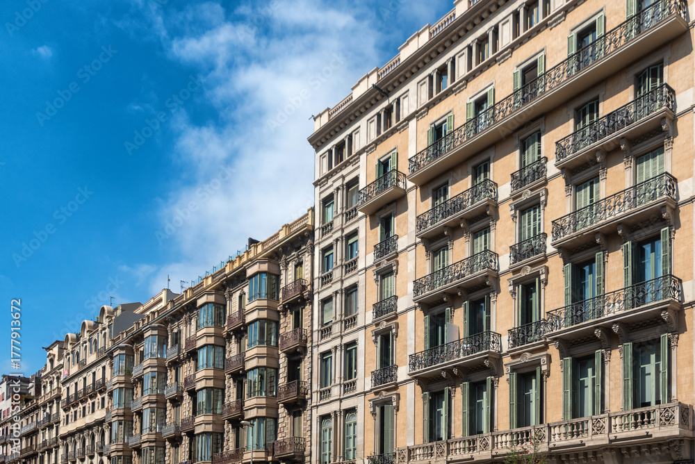 Gothic architecture residential building facades in Barcelona, Spain