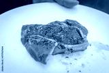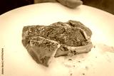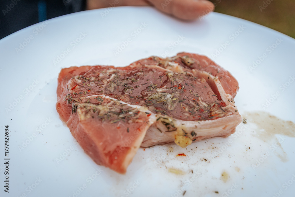 Close-up of a raw steak sizzling on a hot, oiled grill plate, beginning to cook over an open flame during an outdoor barbecue session.