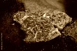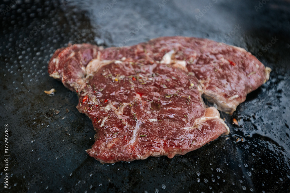 Four juicy steaks sear on a sizzling hot flat grill beside open flames, cooking in their own juices with a perfect crust forming on the surface.