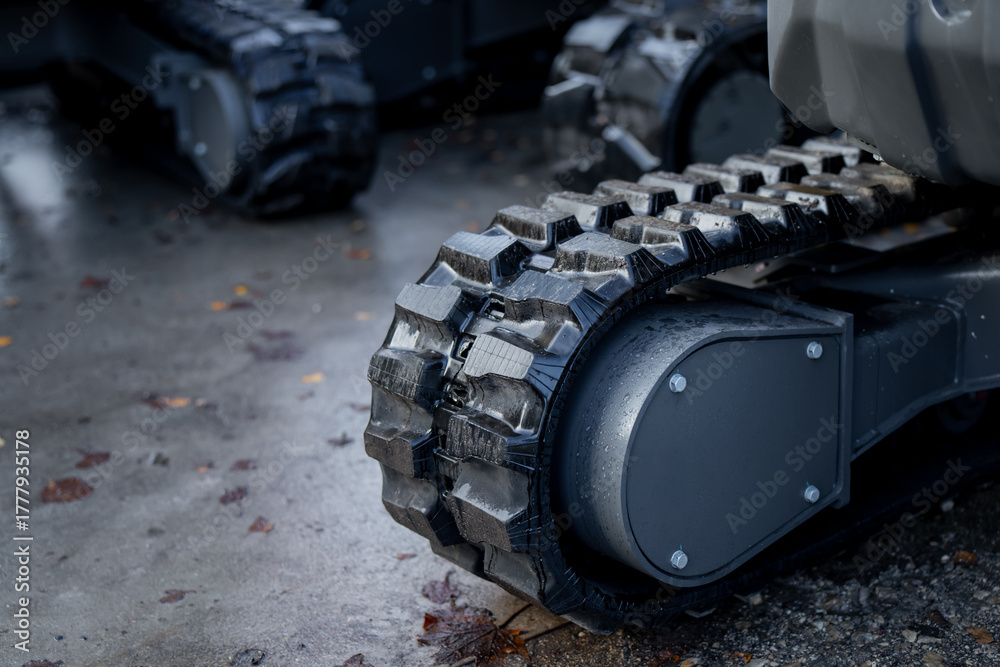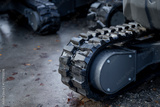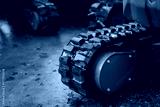 Compact excavator undercarriage with reinforced rubber tracks, drive roller and tension system used for terrain traction and precise machine movement