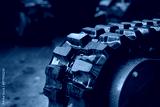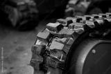 Heavy-duty excavator track tread with visible traction profile and reinforced rubber structure designed for grip and terrain durability in compact machinery