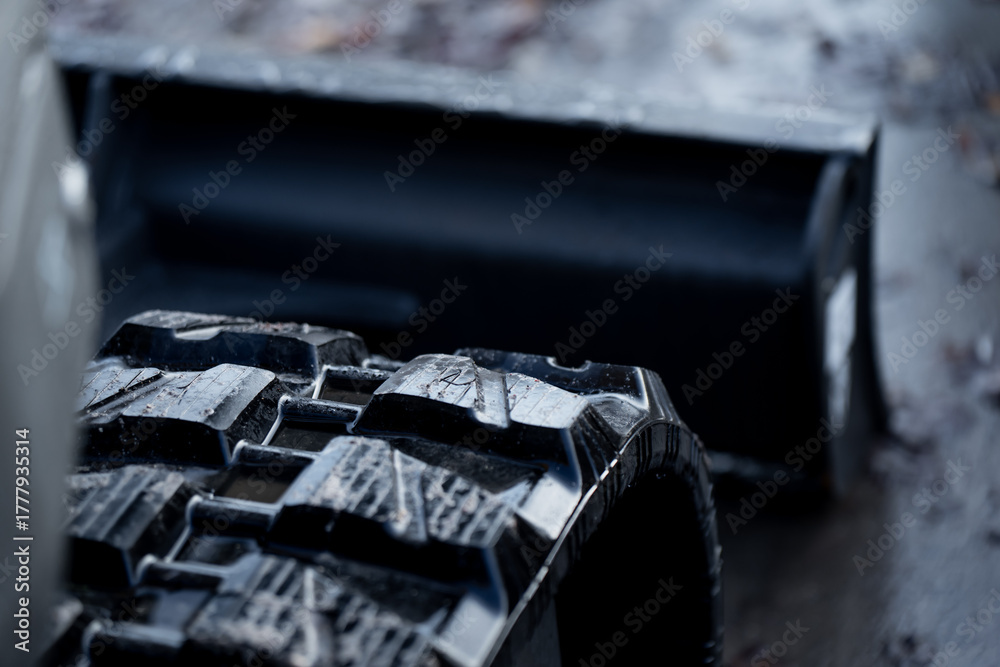 Mini excavator rubber crawler track and front blade on wet construction surface showing detailed traction tread and steel blade alignment in working position