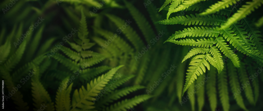 Panoramic view of fern foliage with selective focus and depth. Subtle bokeh for atmospheric botanical backdrops, covers and banners.
