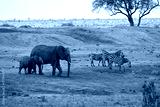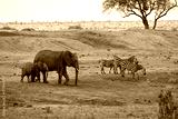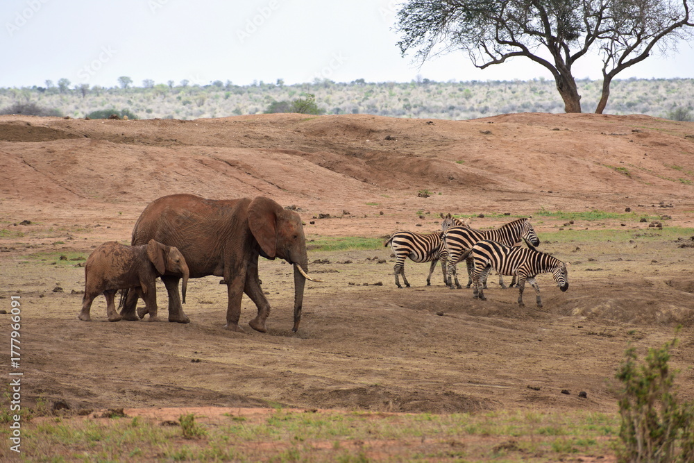 African wildlife scene: elephant family and zebras on savanna