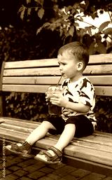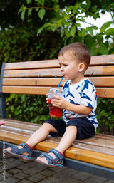Little boy sipping juice on a park bench. A toddler sits on a wooden bench and drinks a red beverage through a blue straw. Green leaves frame the scene on a warm day.