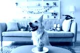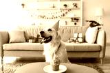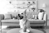 A cheerful golden retriever wearing a pink party hat sits in a cozy living room filled with gifts. A cake is placed on the table, highlighting the festive atmosphere.