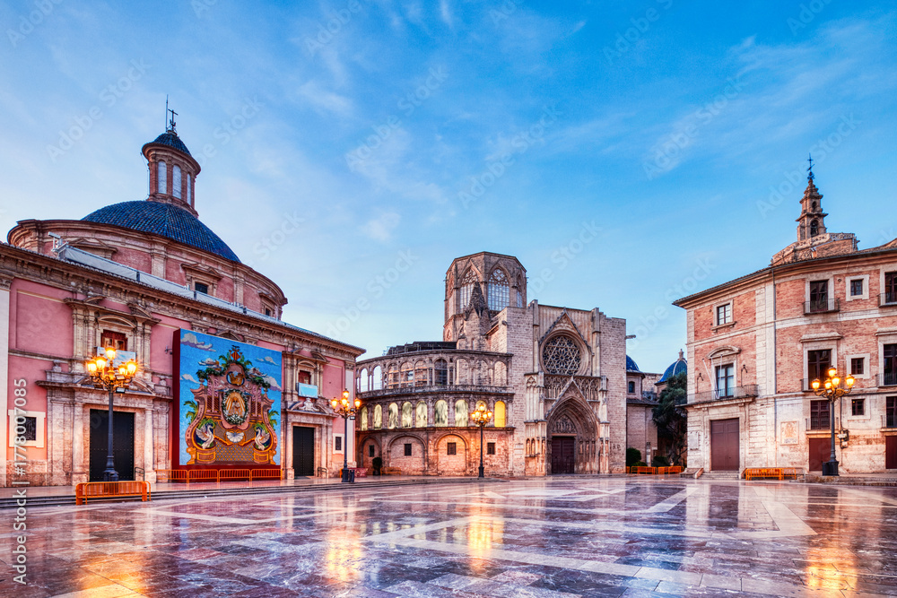Placa de la Verge with Turia Fountain and Porta de l'Almoina and Basilica, Valencia