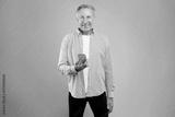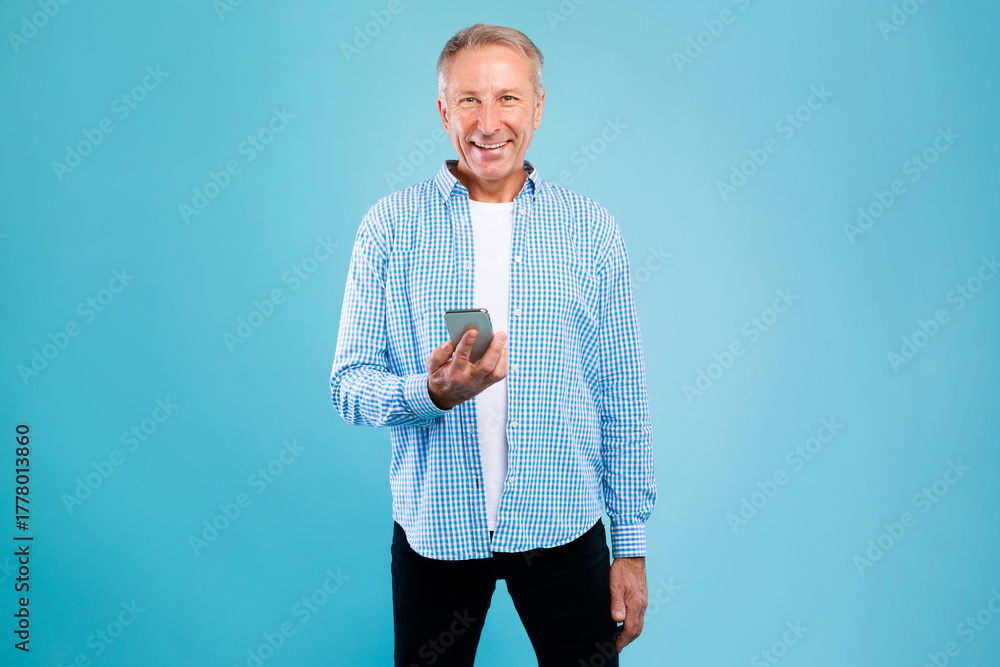 Cheerful senior man stands in a blue studio, using his smartphone. He looks at the camera with a big smile, enjoying his time with the gadget. The setting is bright and inviting.