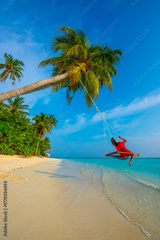 Tranquil closeup calm sea water waves with palm trees. Woman Swinging on the tree. Tropical island beach landscape exotic shore coast. Summer vacation, holiday amazing nature, Maldives.