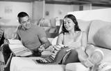 Husband and wife choose color and material for future sofa according to the samples of materials in a furniture store