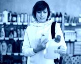 Woman client scan QR code on package and downloads promo code to purchase liquid detergent. Consumer receive information about product in online customer service. .