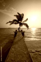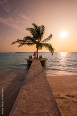 Tranquil closeup calm sea water waves with palm trees. Tourist posing at sunset time. Tropical island beach landscape exotic shore coast. Summer vacation, holiday amazing nature, Maldives.