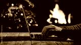 A man works on a laptop in front of a fireplace and a Christmas tree. Freelancing, remote work, or studying at home during the holidays. A warm festive atmosphere for New Year or Christmas.