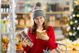 Teen girl looking at sweets in store. Market visitor choose consider nougat, panettone, marzipan, cookies, chocolate. Customers choose national European sweet desserts in sales area