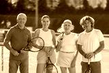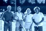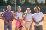 Group of friends or family in sportswear spending time playing sports and posing on tennis courts after match on sunny day