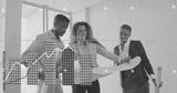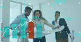 Business professionals reviewing blueprint in office, with rolled drawings, charts and graphs