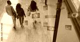 Walking trio in business attire carrying tote bag, folder and work bags in lobby, floating panels