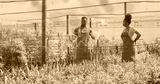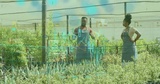 Examining succulents, two nursery workers monitoring plants under mesh shade with irrigation lines