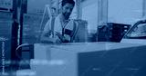 Warehouse worker scanning cardboard box with barcode scanner on trolley, with racks and pallets