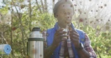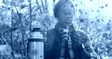 Man wearing blue vest sipping from metal cup in forest clearing, with thermos and sleeping pad