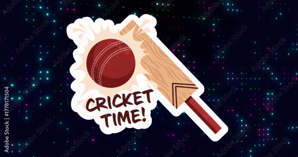Showing sticker featuring wooden cricket bat hitting red ball on matrix backdrop with Cricket Time!