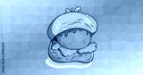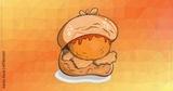 Showcasing fried chicken sandwich with sesame-seed buns dripping red sauce on polygonal backdrop