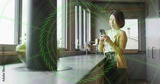 Checking smartphone woman leaning on marble counter in kitchen, with kettle, apple, copy space
