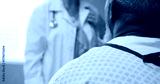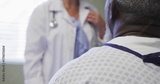 Sitting patient consulting with doctor in examination room, with stethoscope and hospital gown