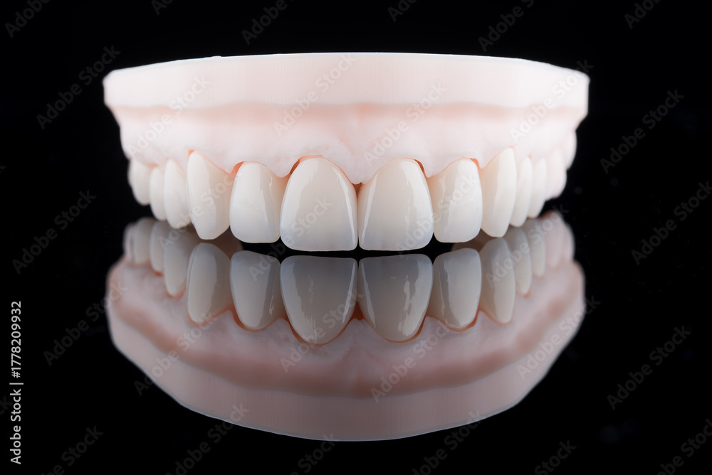 Quality dental zirconium crowns of upper jaw stylized as young teeth on 3D printed model.