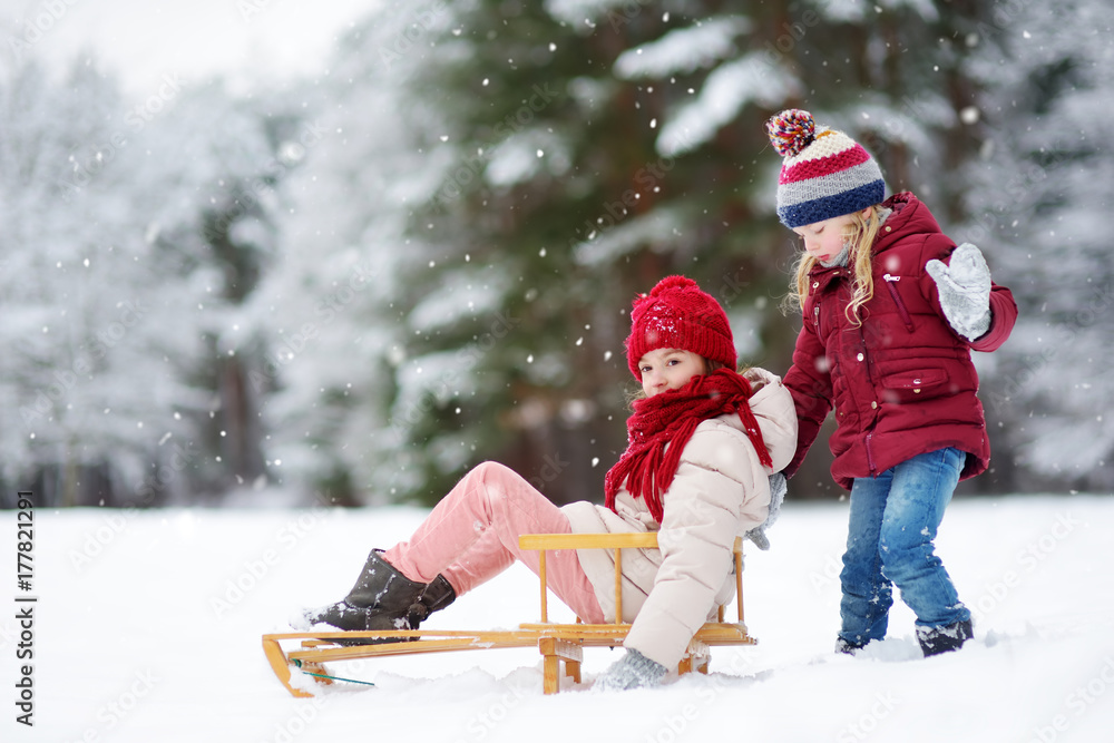 Two funny little girls having fun with a sleight in beautiful winter park. Cute children playing in a snow.