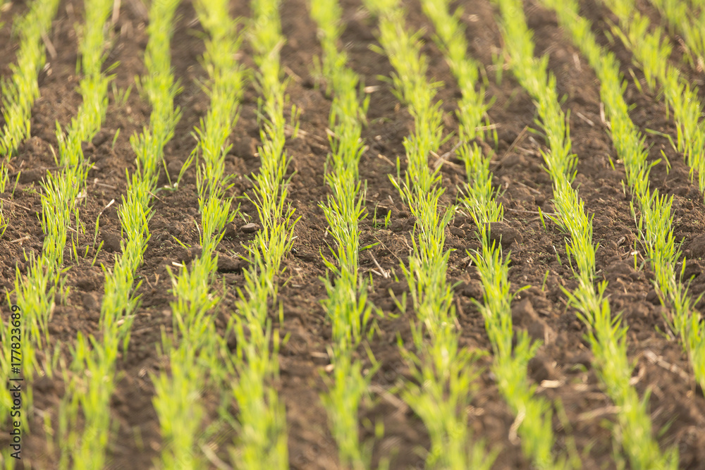 Young green wheat seedlings growing in a soil. Agriculture and agronomy concept. Nature background with selective focus