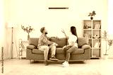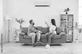 Young family couple sitting on sofa in living room and turning on air conditioner. Happy man and woman using remote control and setting up comfortable temperature on AC system to cool down their home.