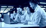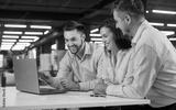 Salesman shows samples on laptop to clients in showroom. In a meeting, he gives concise presentation and demo, outlining offer and sale terms. Sales presentation and offer for home renovation.
