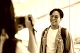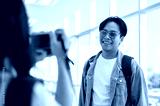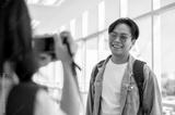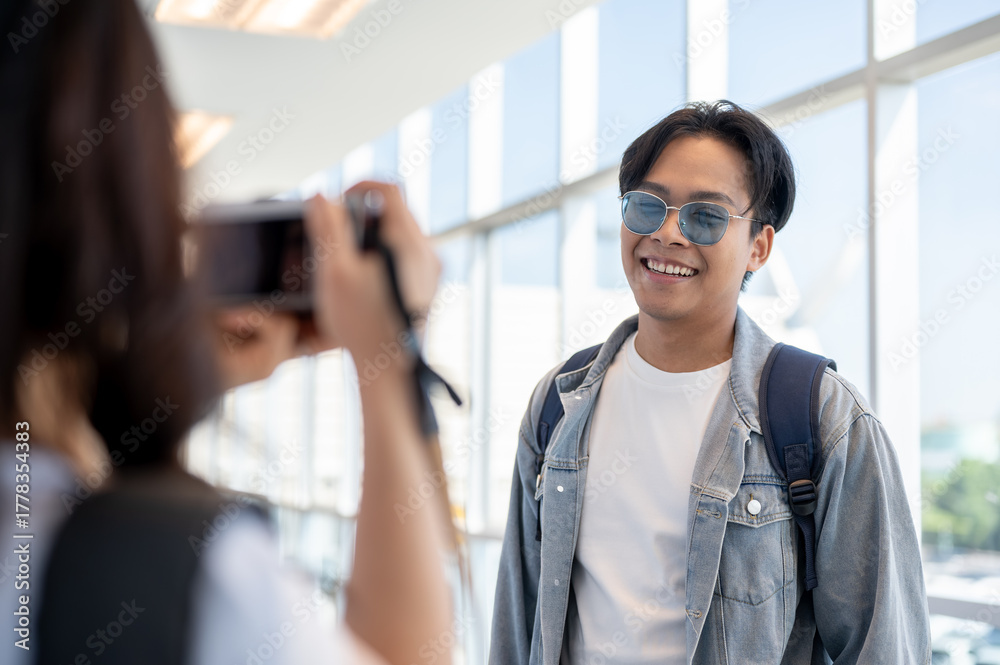 Tourist couple go on trip a woman holding camera taking photo of asian man while standing in airport