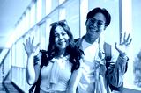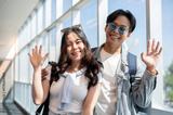 Happy asian tourist couple go on a trip man and woman waving a hand while standing in the airport.